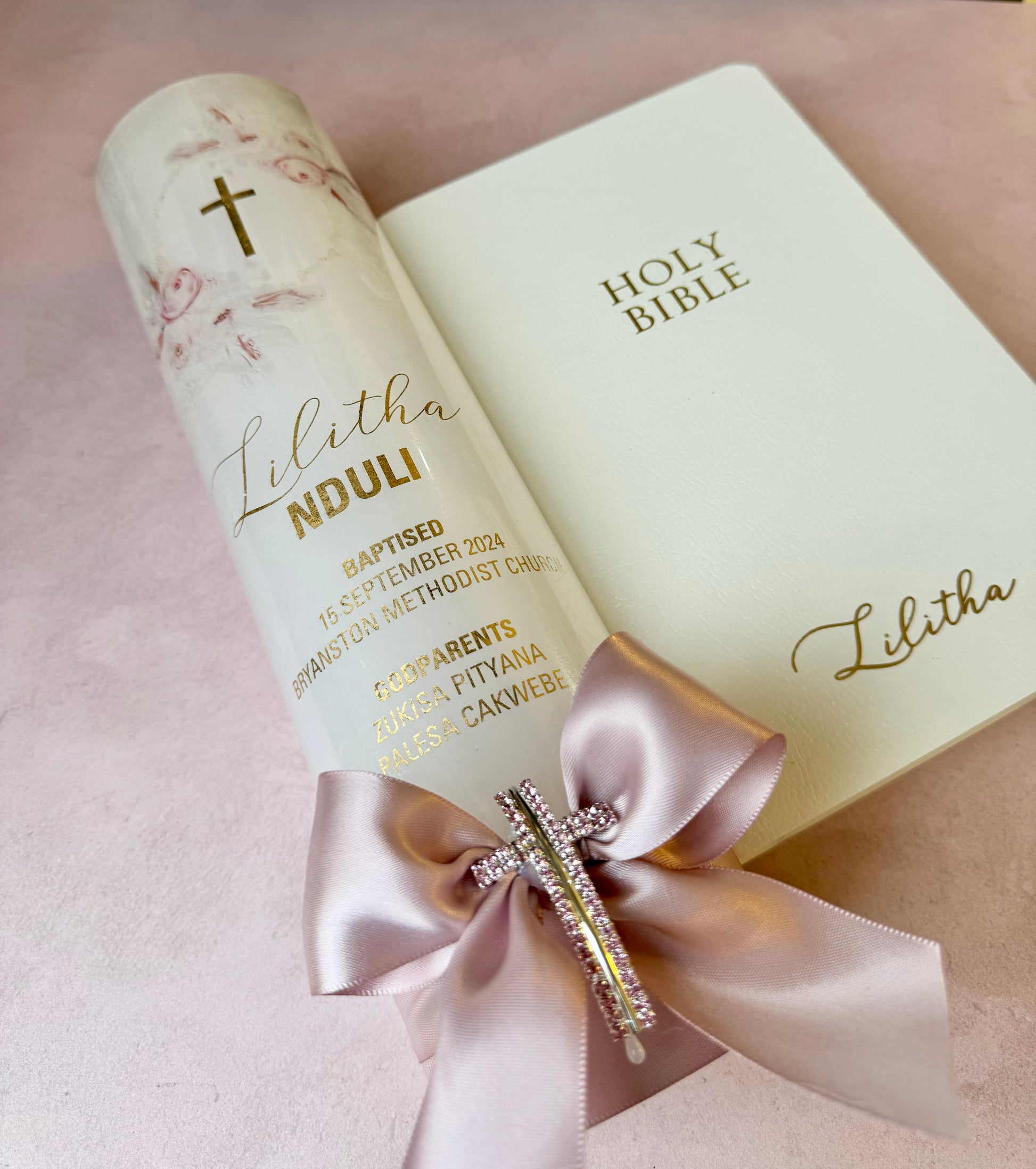 Celebrate the sacred milestone of baptism with our Personalized Baptism Candle and PU Leather Bible Set. This beautiful set includes a personalized candle, making it a cherished keepsake of the special day. The NKJV PU leather Bible offers a sleek and durable design, featuring a soft-touch cover with gold or silver personalisation. Gift Bibles available in White, Black, Navy and Pink.