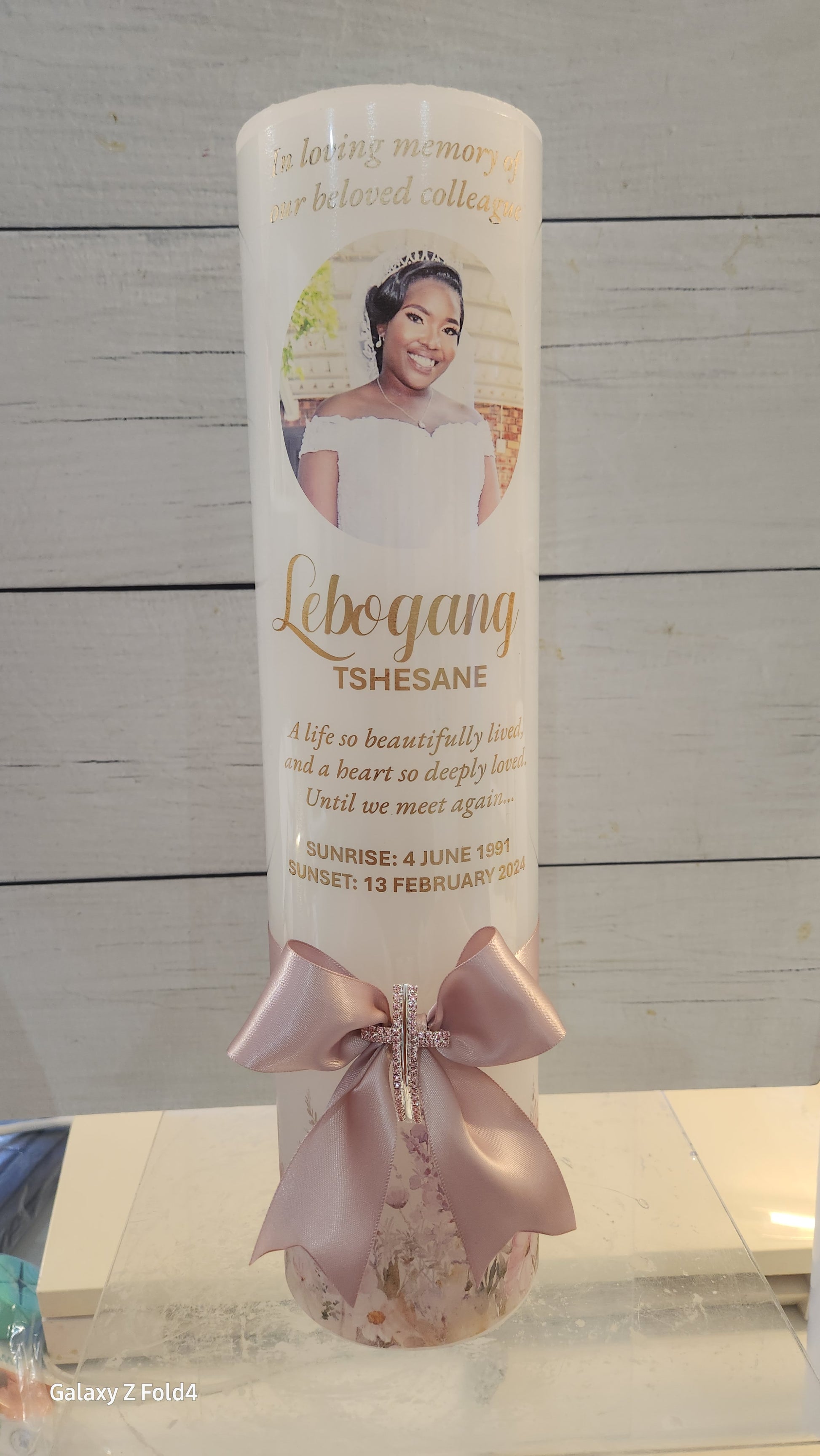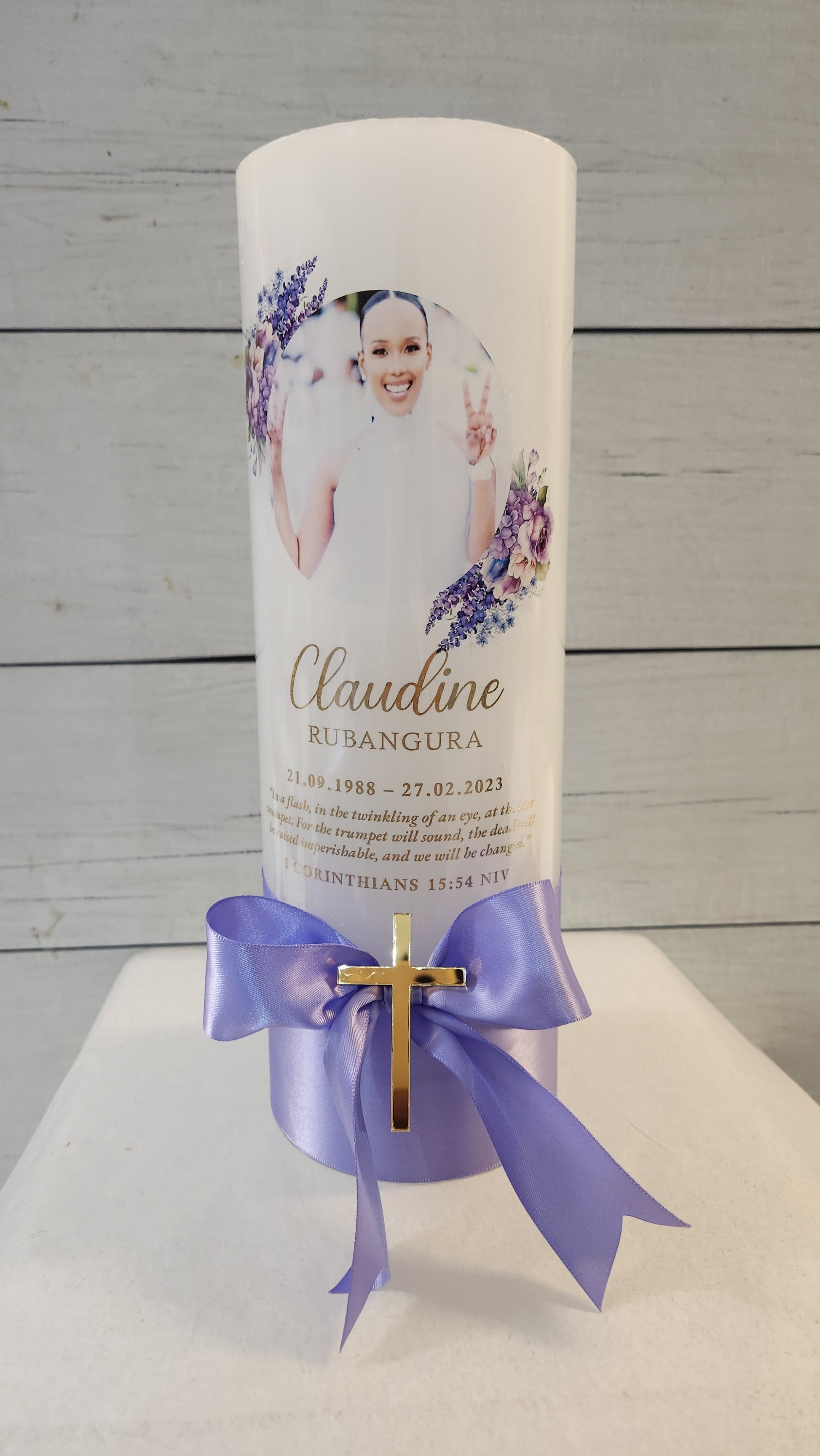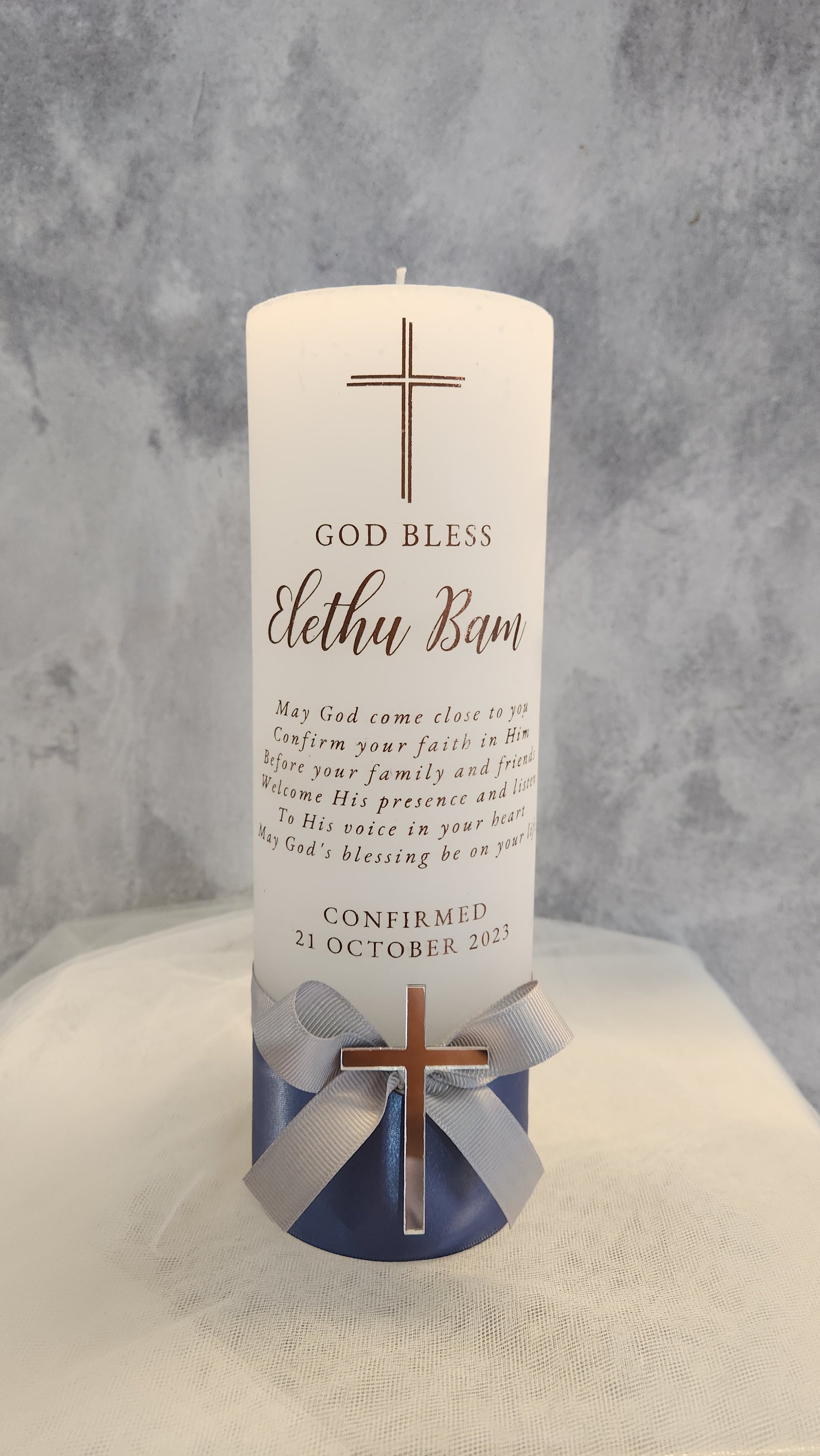 Personalized 80x290mm pillar candle. Add your choice of print on the candle or candle wrap, complete with embellishments and ribbons.