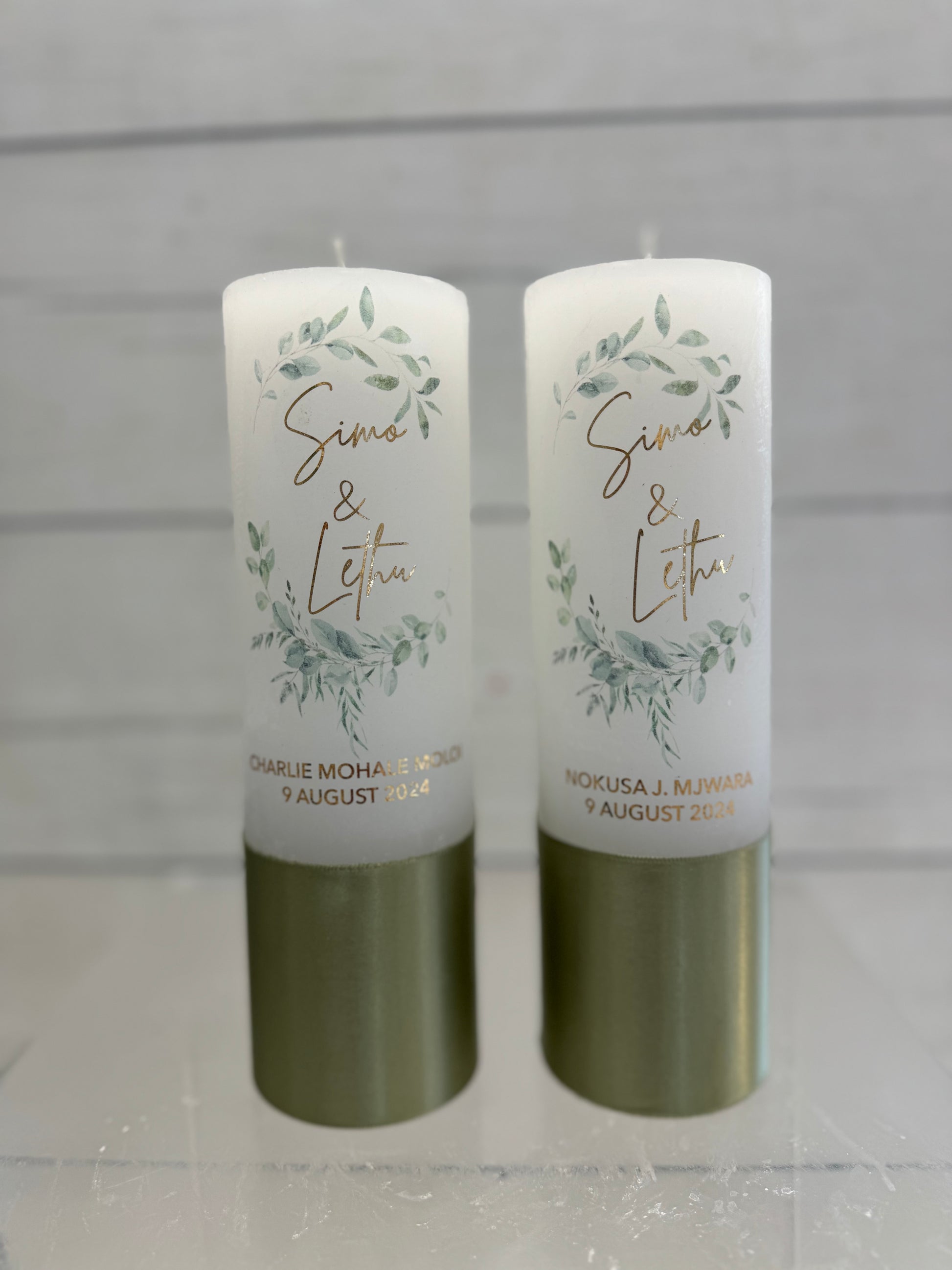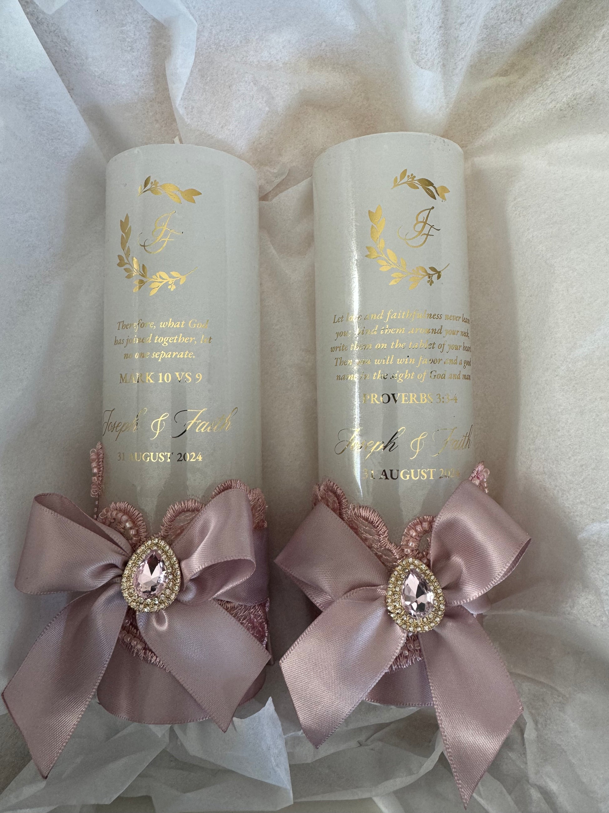 Personalized 60x290mm pillar candle. Add your choice of print on the candle or candle wrap, complete with embellishments and ribbons.